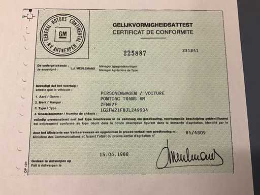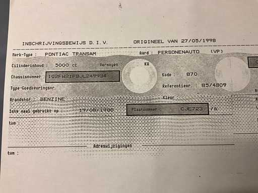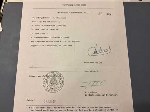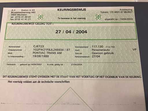 Unieke Pontiac Trans Am GTA uit 1988, uitgerust met de geliefde 5.0 V8 Tuned Port Injection en automatische transmissie. Dit exemplaar werd nieuw ingeschreven op 19/08/1988, en is dus een échte ORIGINELE BELGISCHE WAGEN — geen latere import, wat zeldzaam is voor dit model - De Trans Am GTA is het topmodel binnen de Firebird-lijn en staat bekend om zijn krachtige V8, sportieve look, aerodynamische carrosserie en luxueuze uitrusting. Dit exemplaar heeft bovendien de kenmerkende GTA honeycomb velgen (goudkleurig), die volledig bij de periode horen - Het voertuig stond tot ca. 1 maand geleden altijd binnen gestald. Hij werd niet gestart (ook niet met booster), dus de werking van de motor is onbekend - Lichte gebruikssporen rond carrosserie (zie foto's) - Interieur volledig aanwezig, leder met gebruikssporen passend bij leeftijd - Velgen origineel GTA, banden oud - Laatste keuring gedateerd 27/04/2004 (op 117.130 km) - Gelijkvormigheidsattest en individueel goedkeuringsdocument aanwezig (originele papieren, geen kopieën)