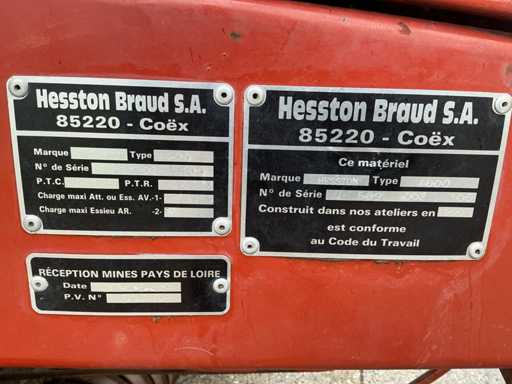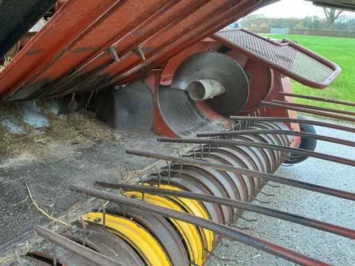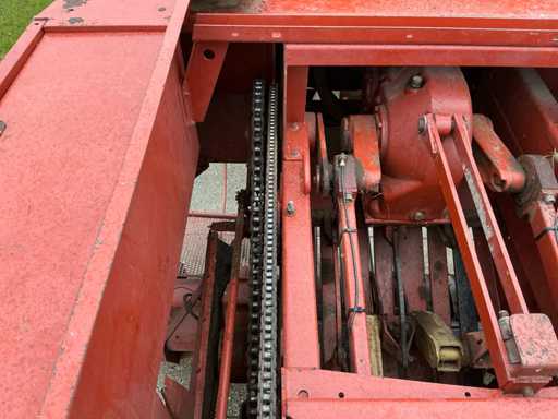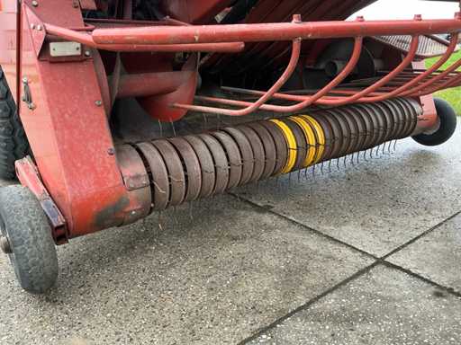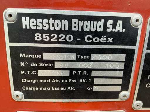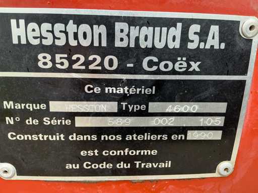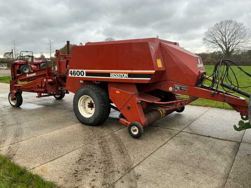 Voorzien van: touwbinding, aftakasvereiste: 540 tpm, vereist één set externe hydrauliek, opraapbalenpers met middeninvoer en in-line ontwerp, Hesston 4600, afmetingen (veldpositie), breedte 2520 mm, lengte 6060mm, hoogte 1720 mm, bodemvrijheid 105 mm, banden 9,5L-14, 6-laags tubeless, opraapmeter 3,00 x 12, nokkenasgestuurde trommelopraper, hoogteverstelling met handkruk, breedte 1960mm, aantal tandbalken 4, aantal tanden 112, tandafstand 66 mm, snelheid 113 tpm, type pakker- en vulvingers, vijzeldiameter 457 mm, vijzelsnelheid 113 tpm, pakkervingersnelheid 101 tpm, vulvingersnelheid 92 tpm, slagen per minuut 92, slaglengte 584 mm, perskamer breedte 457 mm, hoogte 356 mm, bereik van baallengtes 305 mm tot 1320 mm, balendichtheidsregeling persrails (primair), hooiwiggen (secundair), verlichting, aftakas, aantal riemaandrijvingen 1, aantal kettingaandrijvingen 3,aantal tandwielaandrijvingen, aantal kruiskoppelingen 3, slipkoppeling beveiliging aftakas, breekbout beveiliging vliegwiel, slipkoppeling beveiliging pick-upaandrijving, breekboutbeveiliging pakker, vulmachine, pick-upaandrijving, breekbout knoperaandrijving.