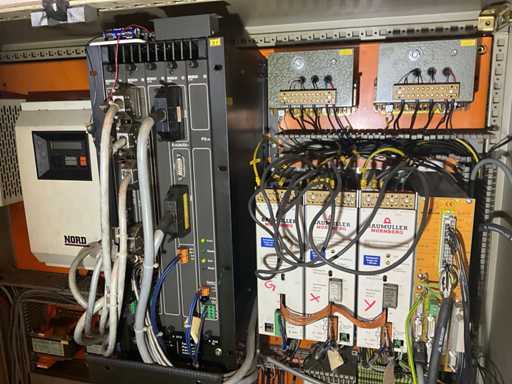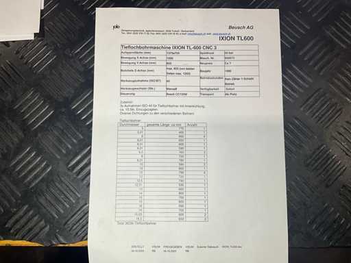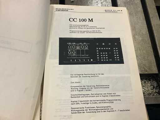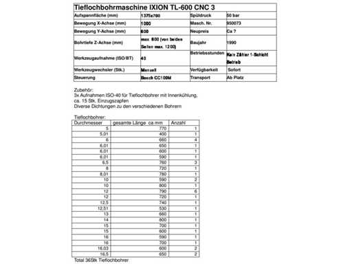 Beweging X-as 1000 mm, Beweging Y-as 600 mm, boordiepte Z-as maximaal 600 mm (maximaal 1200 mm aan beide zijden), besturing "Bosch Type CC 100", inclusief toebehoren 3 stuks ISO-40 houders voor diepgatboren met inwendige koeling, +/- 15 stuks invoerpennen, 36 diepgatboren tot lengte 800 mm (diameter zie foto's), diverse afdichtingen voor de boren, documenten aanwezig, oliekoeling, gewicht geschat ca. 4500 kg,