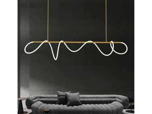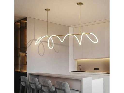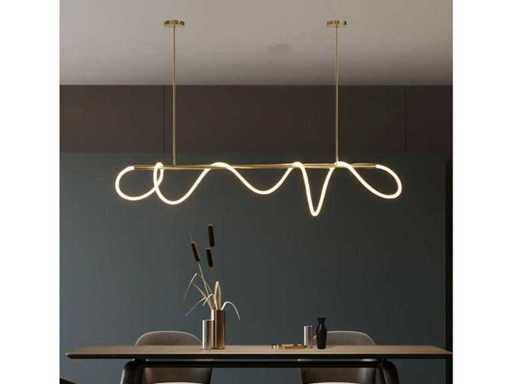 Ropu 120 LED goud, pendel design armatuur, geschikt voor de woonkamer, keuken, slaapkamer of gang, maar ook in werkkamers of ontvangstruimten. De lamp is voorzien van een onafgebroken opalen led lichtbron welke warm wit licht geeft. Eenvoudige montage, flexibele ophangset voor hoogte verstelling. Product eigenschappen: Aantal lichtbronnen: 1. Afmeting ca.: 1200 mm x 250 x mm x 1200 mm. Lichtbundel ca 170 graden. Licht sterkte 60 Watt: Lichtkleur: Warm wit. Aansluiting: 230 Volt. Kleur: Goud. Dit betreft een nieuw product.