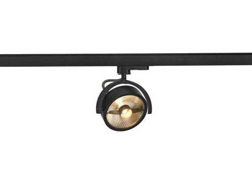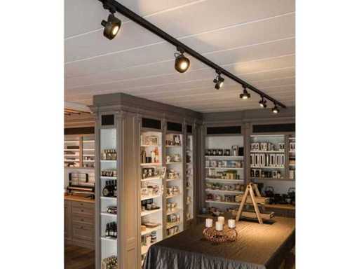 Chique rail systeem geschikt voor de verlichting van een kantoor, werkkamers, ontvangst ruimten, studeerkamers of de showroom, tevens geschikt voor gebruik in de woonkamer, keuken, gang of in slaapkamer. Eenvoudig te plaatsen, geschikt voor gebruik met ieder led of halogeen lichtbron van het type ES111/GU10, kantel en roteerbaar, bieden veel nauwkeurigheid voor de afstelling van het licht, voorzien van een 1 fase rail connector, dimbaar, wordt compleet geleverd inclusief alle koppelstukken voor zowel een rechte plaatsing of in een L vorm. Uitbreidbaar met meer rails of armaturen. Dit kavel bestaat uit: 8 x 1 fase railarmatuur 95 cm, 2 x aansluiting voeding 5 cm, 4 x recht koppelstuk, 4 x hoek koppelstuk, 20 x rail armaturen + eindkappen. afmeting van ca 12 x 3.5 x 17 cm, fitting GU10, gewicht: 230 gr. (excl lichtbronnen) kleur: mat zwart. Bijzonderheden: Dit betreft een volledig nieuw product