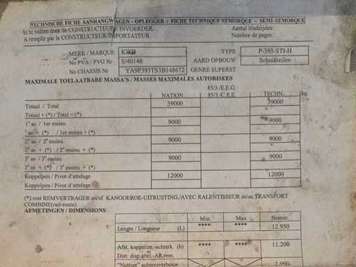 Met een maximaal toegelaten massa van 39.000 kg en een eigengewicht van ca. 8.150 kg biedt deze oplegger een uitstekende laadcapaciteit, ideaal voor palletgoederen, distributie, bulkvervoer en algemene logistiek.