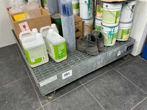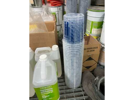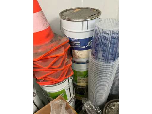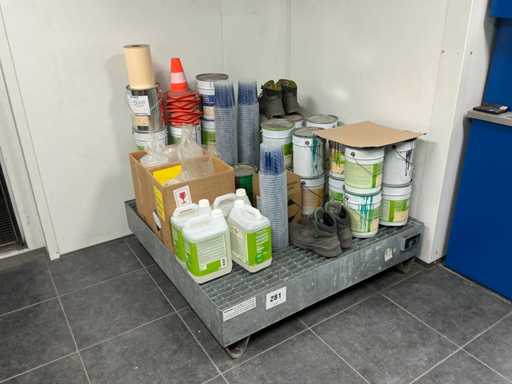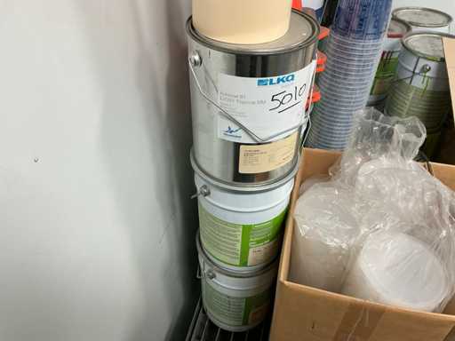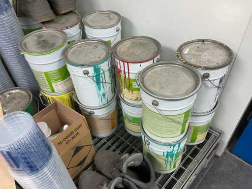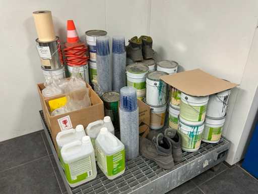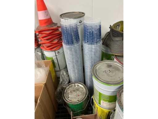 Volume: 200L, compleet met inhoud zijnde diverse open en gesloten potten verf Aknobel, diverse pvc mengpotten waaronder Aknobel en 4x bus verdunner Sikkens 5L