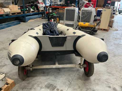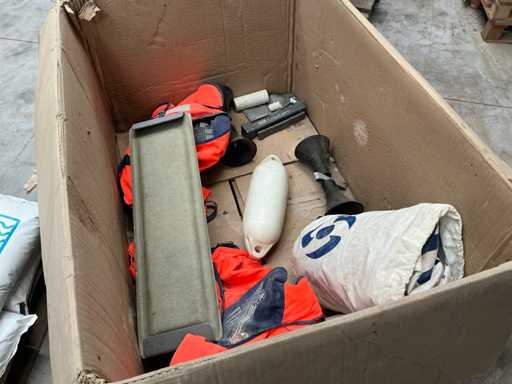 Compleet met transportframe voor rubberboot, 2 roeispanen en enig toebehoren zoals reddingsvesten, boeien,..