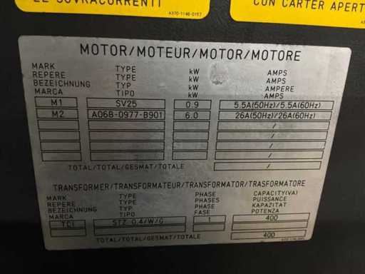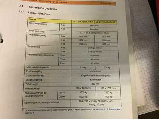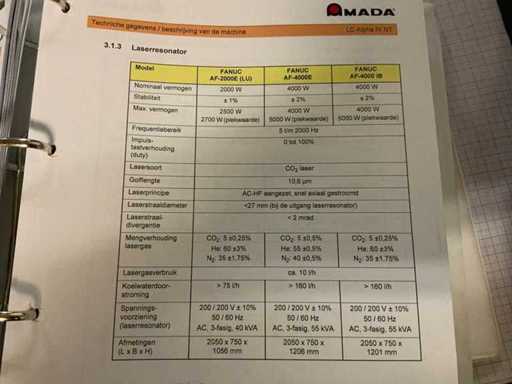 v.v. “Fanuc” laser; type AF4000E; A048-B13-B311; model C4000 815; bouwjaar 2007; 69 kVA; “Amada” wisselportaal; type MP 1225; met “Amada” CNC-besturing; invoerunit; vacuümbeladingsunit; overspanning ca. 7 meter; (2x) palletbunker; max. belasting 3000 kg; “Herding” afzuigunit met filterkast type DELTAComp 1500-5/9 SB (2006), “Riedel” koelinstallatie type PC 315.21-NE-LAS (2006) t.b.v. laserbron; “Atlas Copco schroefcompressor type GA11 (1998) met buffertank en luchtverzorgings unit incl. machine hekwerk