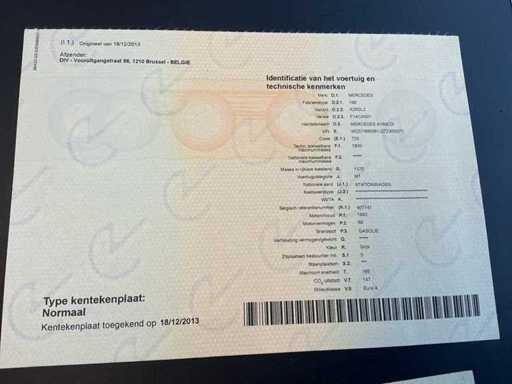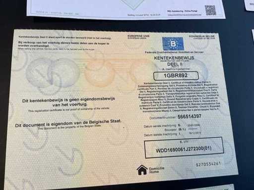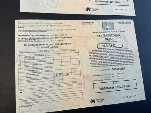Het VIN-nummer van het voertuig is WDD1690061J272300. De Belgische voertuigdocumenten zijn aanwezig, inclusief kentekenbewijs deel I en deel II.