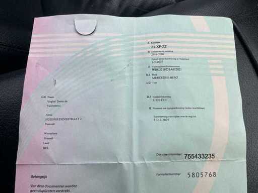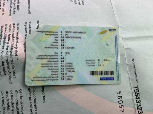 Het VIN-nummer van het voertuig is WDD2210221A052021. De Nederlandse kentekenbewijzen (deel I) zijn aanwezig.
