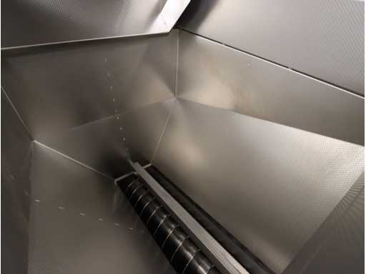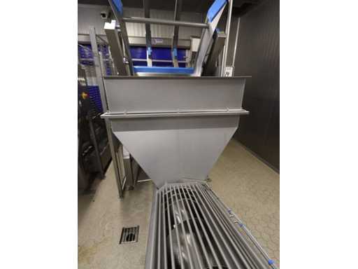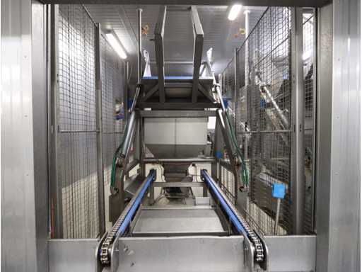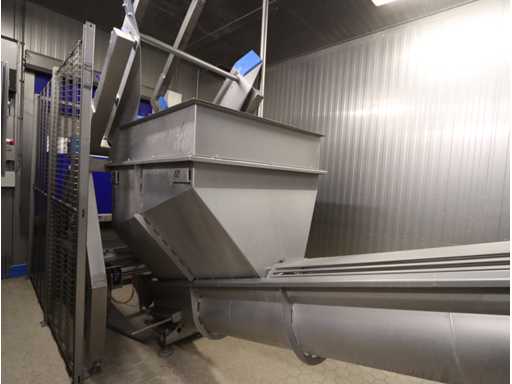 Voorzien van invoer ketting transportbaan, spoorbreedte 850 mm, lengte 2000 mm, inclusief opvoer transportschroef met stortbunker, schroef Ø 400 mm, schroef lengte 4500 mm, uitvoer hoogte 1400 mm, invoer opening bunker circa 1100x1300 mm, zonder bordes en trappen