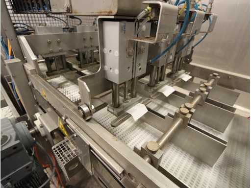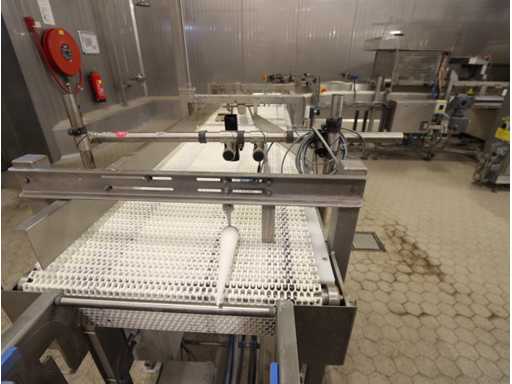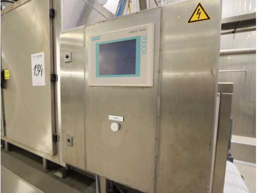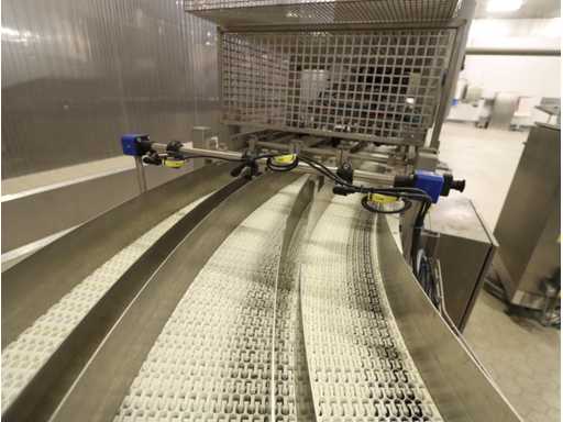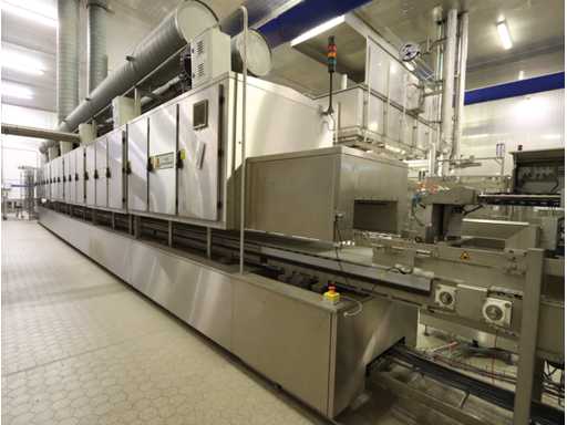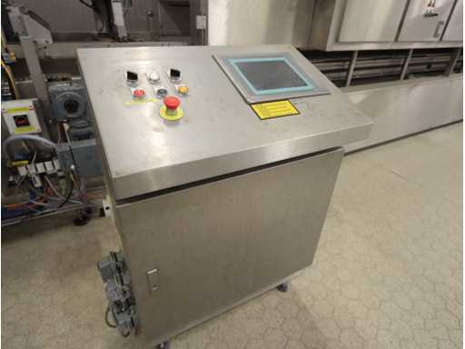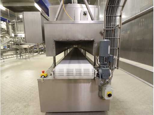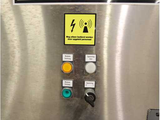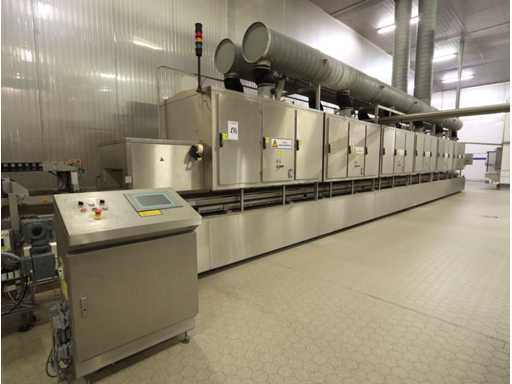 6 units, 42 amp per unit, 3x63 amp zekering, gewicht per unit 1200 kg, frequentie 2450 mhz, met onderlopende transportband, breedte 550 mm, door loop lengte circa 16 meter, voorzien van centrale besturing met touchscreen, uitvoer schakel transportband, zonder afzuiging,