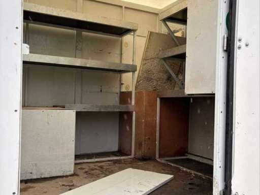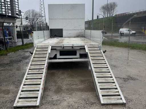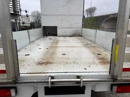 De opbouw omvat een gesloten kast met interne rekken en opbergmogelijkheden, ideaal voor servicevoertuigen of mobiele werkplaatsen. Achteraan zijn aluminium oprijrampen voorzien, waardoor ook rollend materieel eenvoudig geladen kan worden. De combinatie van laadruimte en plateau maakt deze vrachtwagen inzetbaar voor uiteenlopende toepassingen binnen bouw, techniek en logistiek.
