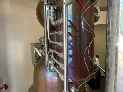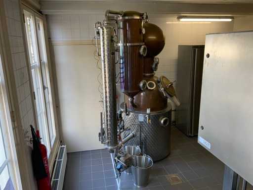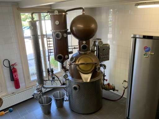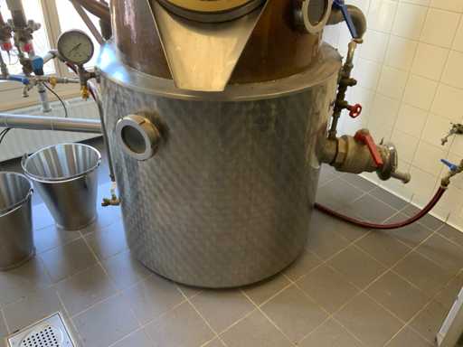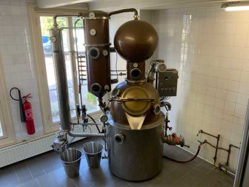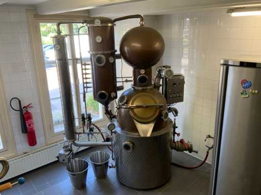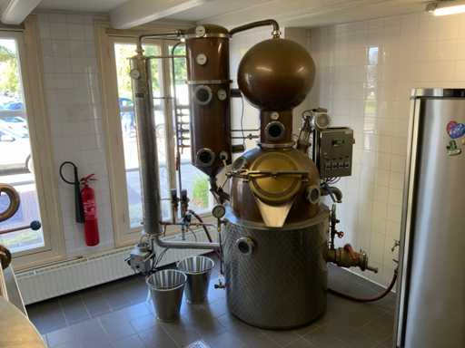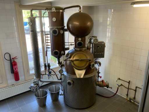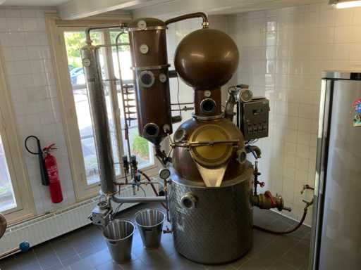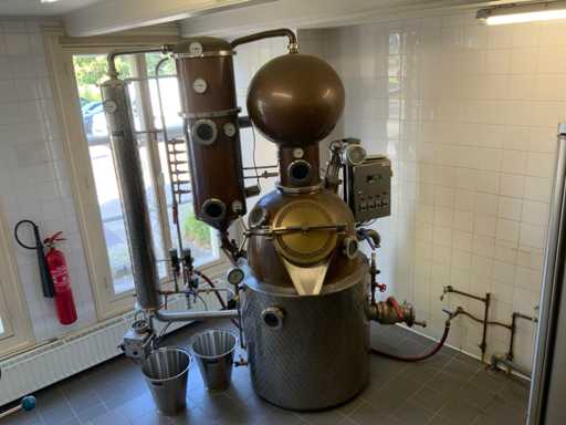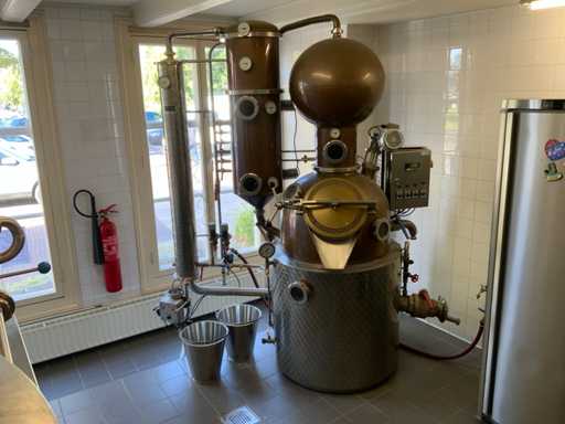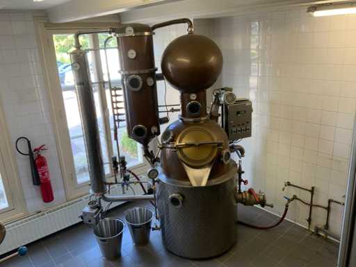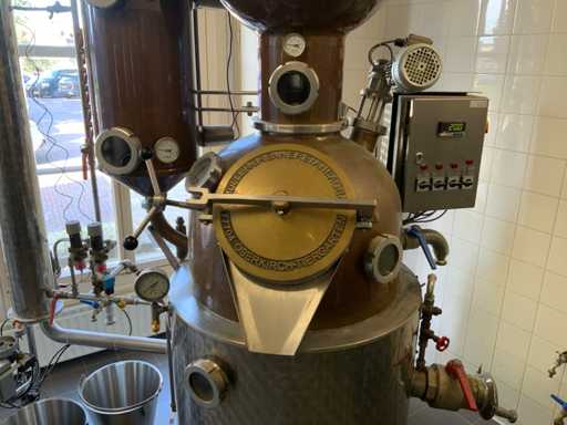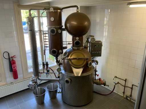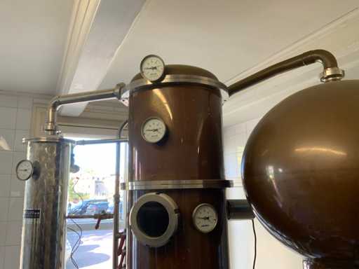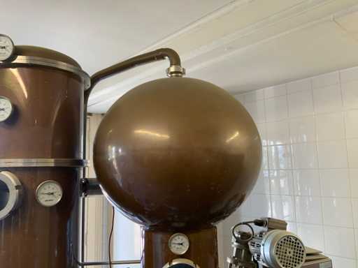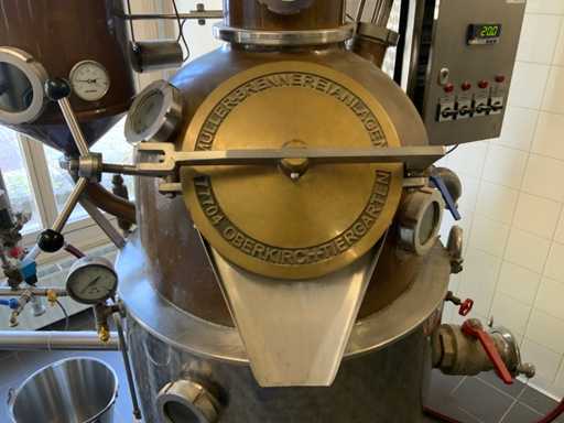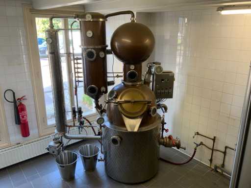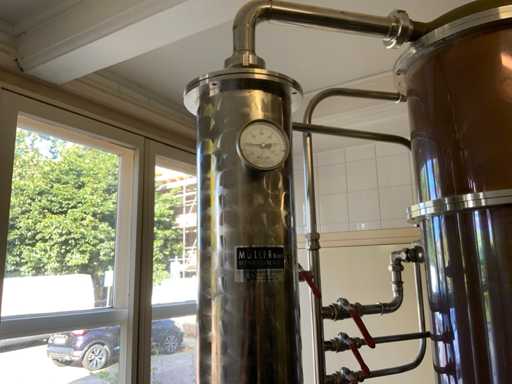 Müller Brennereianlage Typ AROMA IV met aRoMat-verstärker; hoogwaardige vol-koper distilleerinstallatie; model: Typ AROMA IV; waterbad met vuurhaard; koperen ketel 3 mm dik; koud gevormd en gehamerd; keteldiameter 750 mm; aroma-hoed met 100 L stoomruimte en 2 m² koperoppervlak; zijdelingse kolom met geïntegreerde aRoMat-spiraal; RVS buizenkoeler met 1,5 m² koeloppervlak; glockenböden individueel afsluitbaar; sprayball-reinigingssysteem in hoed, kolom en condensor; elektrisch roerwerk met 93 tpm; conische tresteruitloop (Ø 350 mm); verlicht inspectievenster in ketelbrust; heetwatertank 130 L met drukverhogingspomp (tot 6 bar); automatische destillat-trenner DT103 (volgens %vol); centrale besturingskast voor complete systeemaansturing; gepatenteerde Wassergeizer I & II voor terugwinning en verwarming; geïntegreerde koperen katalysator (Kupferadsorber) voor cyanidebinding; extreem aromabehoud dankzij aRoMat-systeem; rendement geoptimaliseerd; onderhoudsvriendelijk; ontwerp volgens Duitse standaard Müller GmbH
