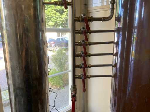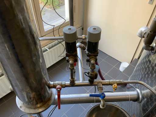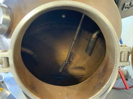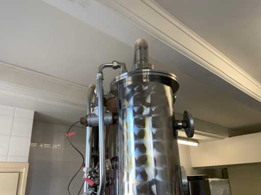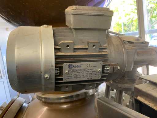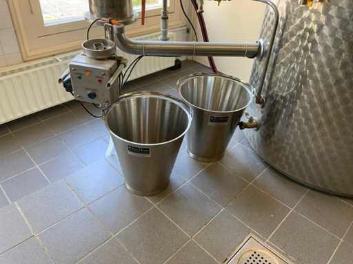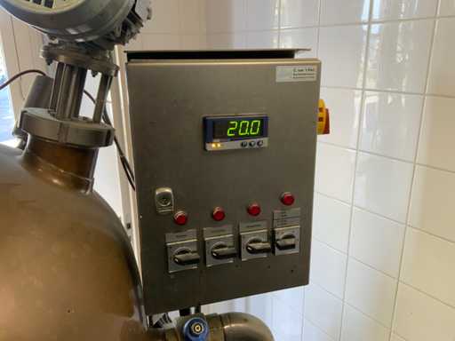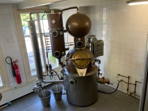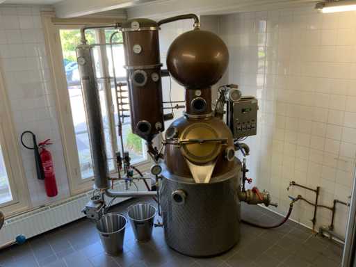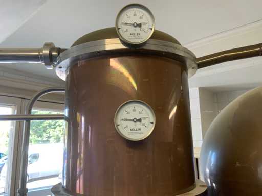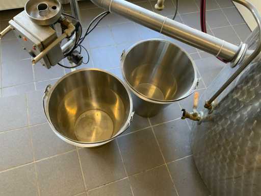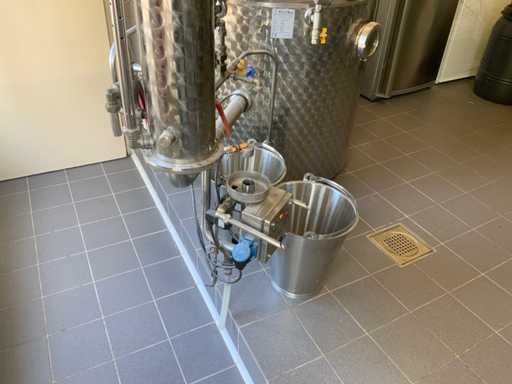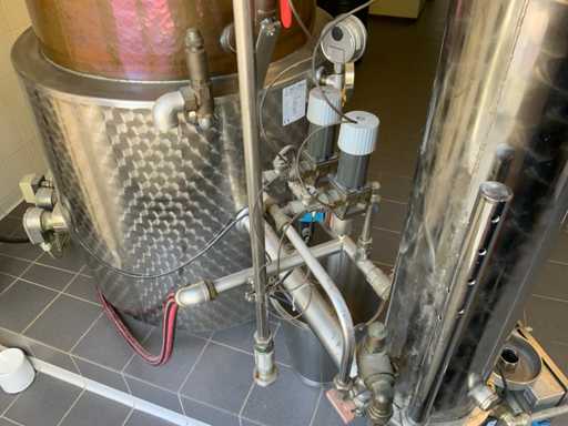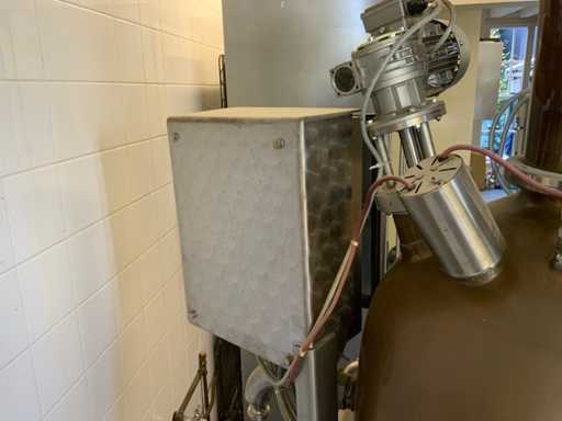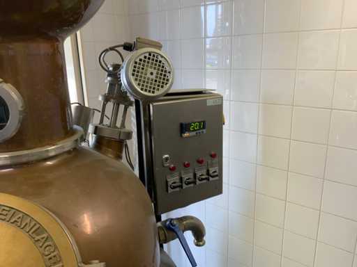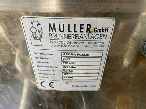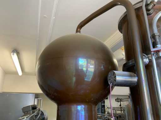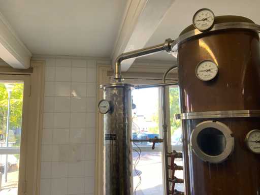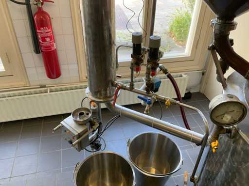 Müller Brennereianlage Typ AROMA IV met aRoMat-verstärker; hoogwaardige vol-koper distilleerinstallatie; model: Typ AROMA IV; waterbad met vuurhaard; koperen ketel 3 mm dik; koud gevormd en gehamerd; keteldiameter 750 mm; aroma-hoed met 100 L stoomruimte en 2 m² koperoppervlak; zijdelingse kolom met geïntegreerde aRoMat-spiraal; RVS buizenkoeler met 1,5 m² koeloppervlak; glockenböden individueel afsluitbaar; sprayball-reinigingssysteem in hoed, kolom en condensor; elektrisch roerwerk met 93 tpm; conische tresteruitloop (Ø 350 mm); verlicht inspectievenster in ketelbrust; heetwatertank 130 L met drukverhogingspomp (tot 6 bar); automatische destillat-trenner DT103 (volgens %vol); centrale besturingskast voor complete systeemaansturing; gepatenteerde Wassergeizer I & II voor terugwinning en verwarming; geïntegreerde koperen katalysator (Kupferadsorber) voor cyanidebinding; extreem aromabehoud dankzij aRoMat-systeem; rendement geoptimaliseerd; onderhoudsvriendelijk; ontwerp volgens Duitse standaard Müller GmbH