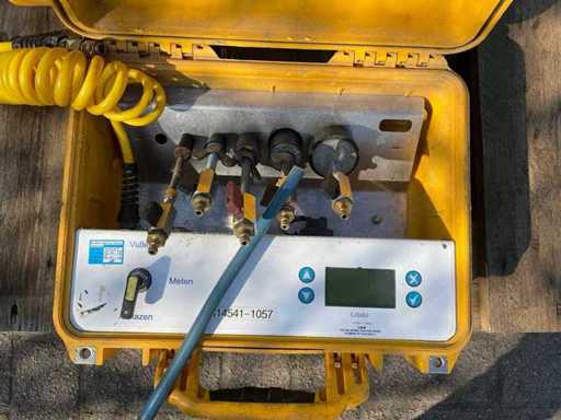 De koffer bevat een digitale display en aansluitingen voor het uitvoeren van lektesten en drukmetingen.