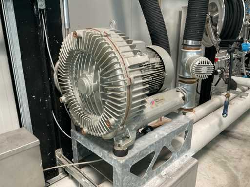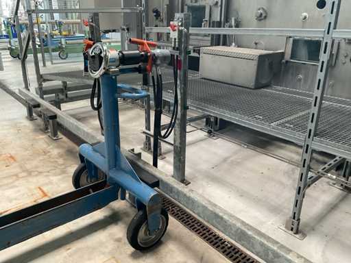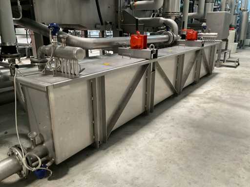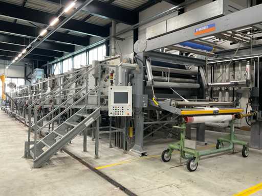 volledig roestvrij staal, stoomverwarmd, schuin gepositioneerd, met 9/7 zones, invoerbreedte ca. 2200 mm, in-feed rolstation met aangedreven (motor) afwikkelaar op hangende standaard/frame, stand voor 2 rollwagons achterste touchscreenbediening, bedieningspaneel aan de voorzijde, compleet met zijdelings geplaatste bassin volume 75/670 liter, 4 kleinere bassinen, ongeveer 36 aangedreven motoren, o.a. Lenze, E+H volumedebietmeters/tellers, diverse pneumatische kleppen, gecombineerde leidingen, 3 Elmo Rietschle luchtblazers, webgeleiding, Elhardt + Leimer, 12 hydraulische rolwinders aangedreven door 2 hydropacks, gegalvaniseerd loopplatform, trappen, totale afmetingen ca. machinelengte 35 x breedte 6 meter, hoogte 3,10 meter, 12-deurs hoofdschakelaarkast met kleine teller en Siemens Sentron PAC3200, Referentienummer #10535 (Exclusieve Weaving Boom Wagons)