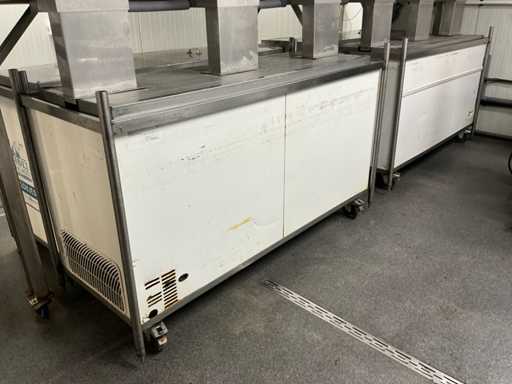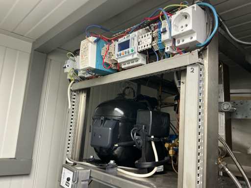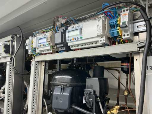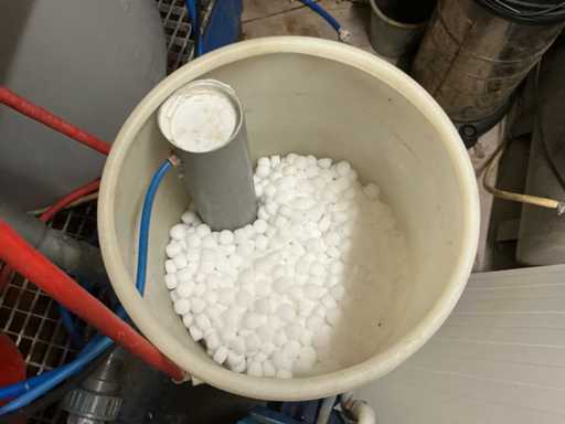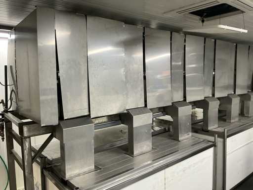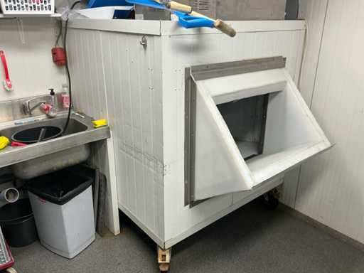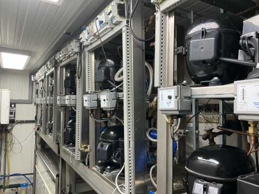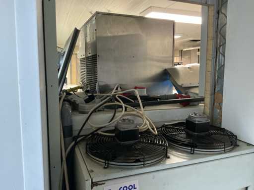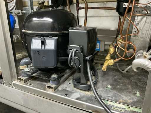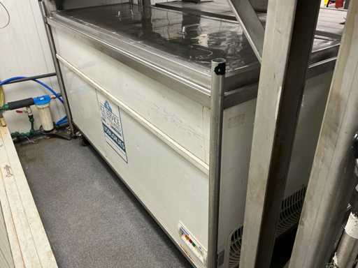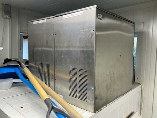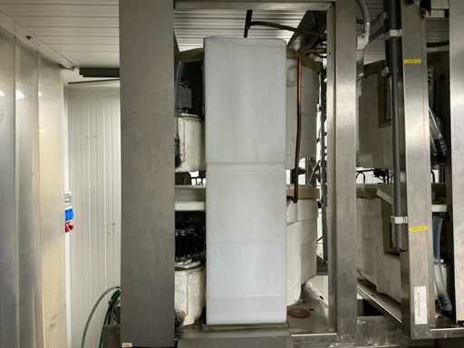 500 ton ijsblokjes per jaar, Voorzien van: 12 ijsmachines, watergekoeld. 2 Crushed ice machines met vriesopslag, Aqualectra osmose apparaat, opslagvaten, onder andere 1500L, 4 opvangvriezers en Siat SM8 verpakkingsmachine, Sealmaster, RVS tafel, handleidingen aanwezig,