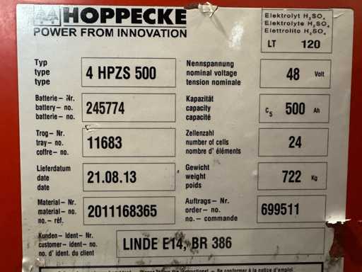 - Accu: 21/08/2013 48V 500 Ah, zeer goede prestaties gemeten met 48,9V