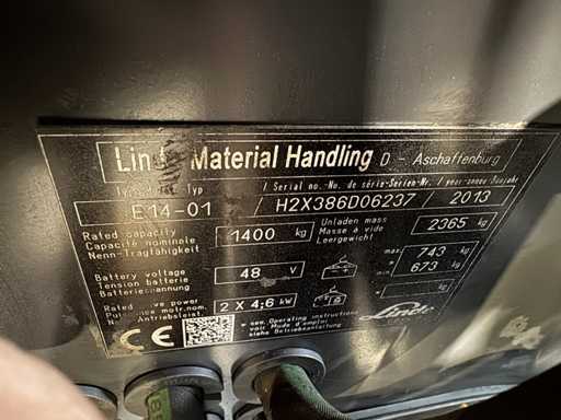2013 Service+UVV 11/2026 Linde E14 1.400kg Duplex Free Lift 3e + 4e klep elektrische heftruck 3.232 uur