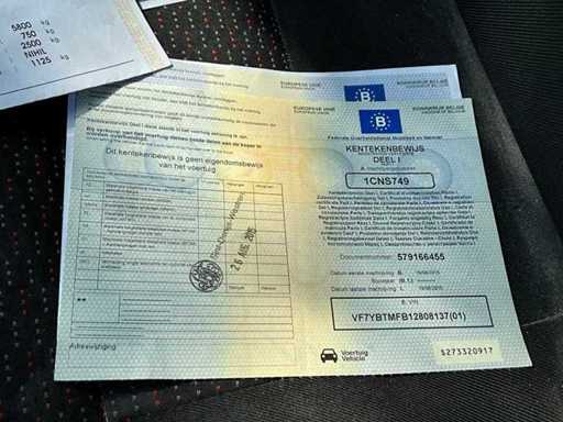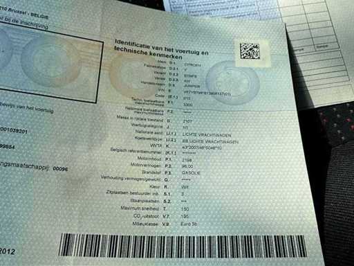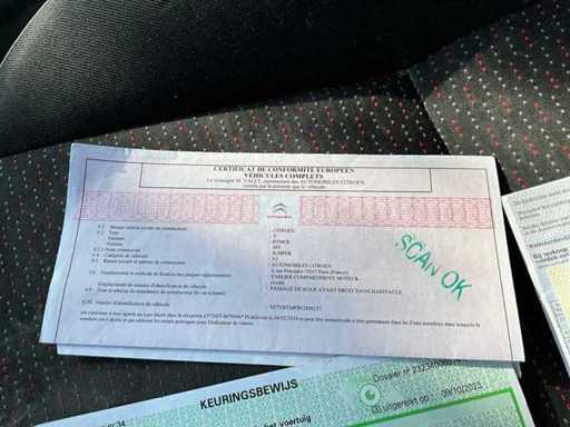 Aanwezige boorddocumenten: kentekenbewijs deel 1, kopie kentekenbewijs deel 2, identificatieverslag, keuringsbewijs (geldig tot 26/8/2024) en conformiteitsattest.