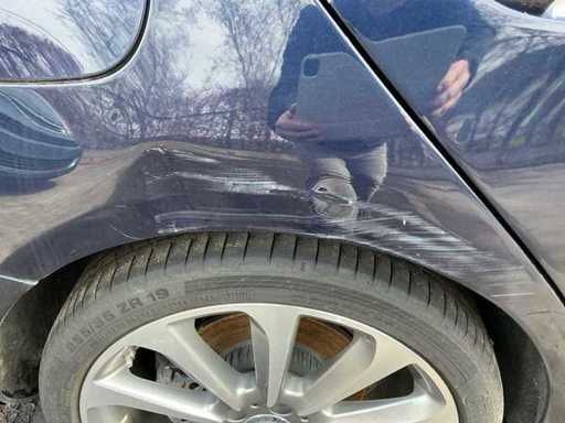 De carrosserie vertoont gebruikssporen conform leeftijd en kilometerstand, waaronder zichtbare schaafschade aan de achterzijde en lichte krassen rondom. Technisch is het voertuig startklaar en rijdend, met een geldige keuring tot 06/02/2026.