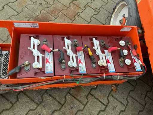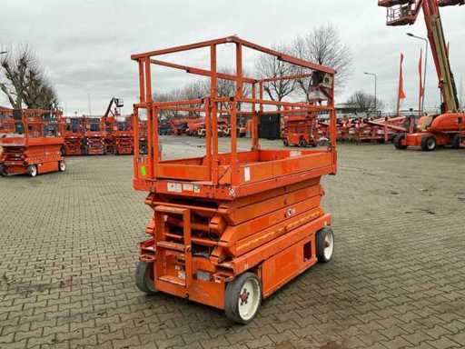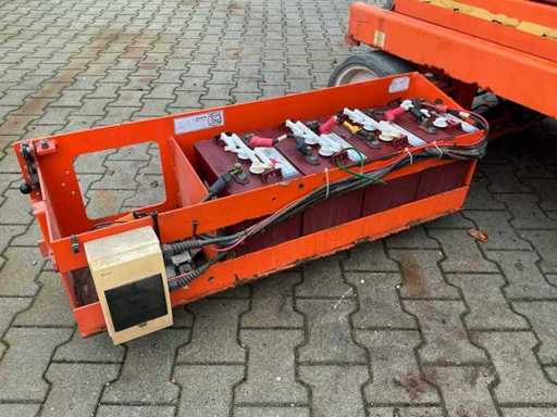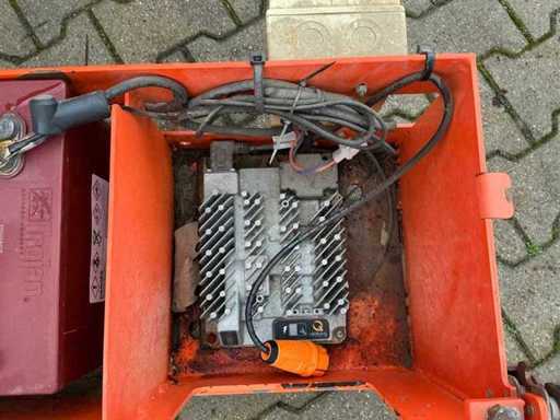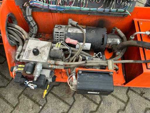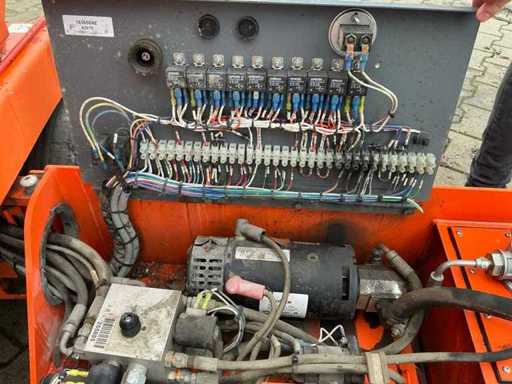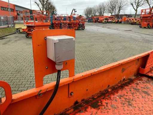 Platform vloerhoogte 7900 mm; uitschuifbaar platform afmeting circa 3150x1070 mm; interne acculader 230 Volt; kooibediening; 230 Volt stroom aansluiting platform; transporthoogte circa 1950 mm; working condition;