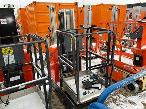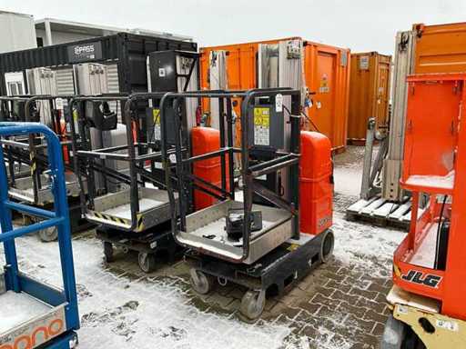 verrijdbaar; staal / aluminium; maximum platform vloerhoogte 5940 mm; kooibediening; 230 Volt stroom aansluiting platform; uitschuifbaar plateau afmeting 1200x650 mm; ingebouwde acculader; 24 Volt; 230 Volt; not working condition;