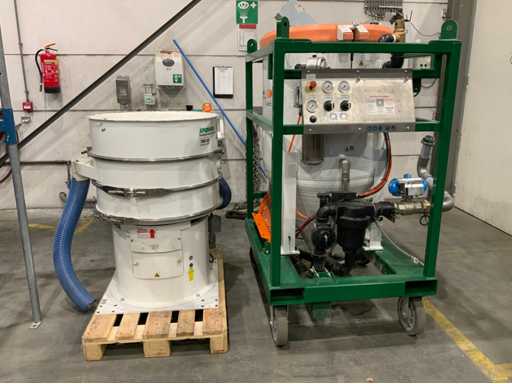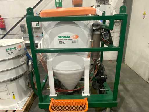 Bigbag installatie: 130x130x150cm, custom frame voor filter 80x190x150cm, SpongeJet in verrijdbaar frame 130x100x180cm, recycler: 80x120cm. 57,7 uur gedraaid. Venturi straallans keramisch gevoerd met 2 diverse straallansen en diverse slangen.