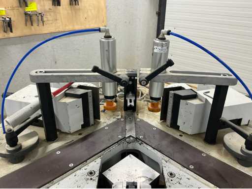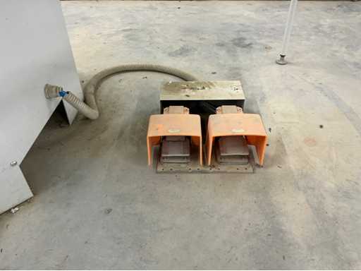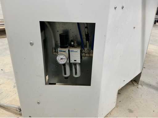 De machine werkt op perslucht (7 bar) en weegt ongeveer 450 kg, wat wijst op een stationaire industriële installatie.