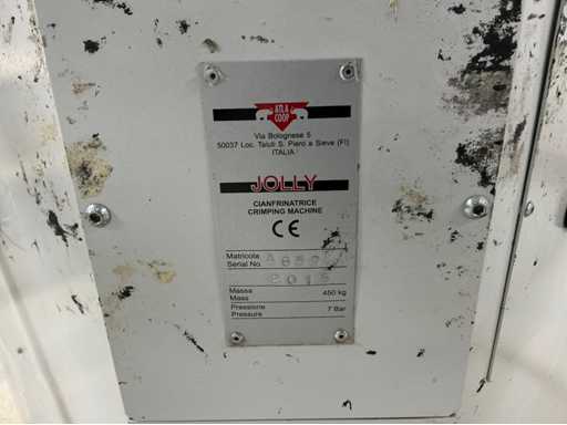 De JOLLY Cianfrinatrice / Crimping Machine is een machine die gebruikt wordt in de metaal- of verpakkingsindustrie om metalen randen te vormen of te sluiten (zoals bij trommels, tanks, blikken) en verbindingen aan te persen bij buizen of omhulsels of crimpverbindingen te maken (mechanische bevestiging zonder lassen).