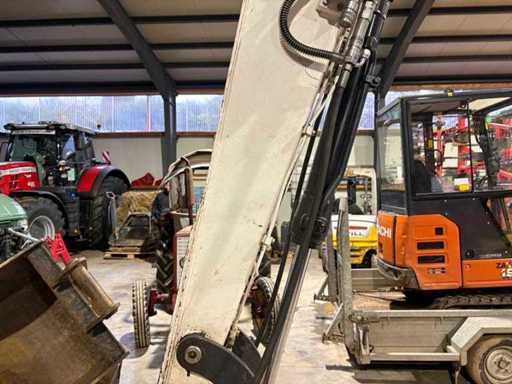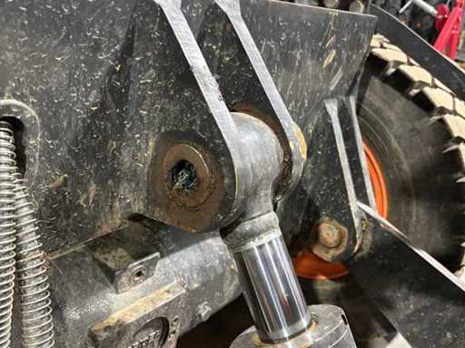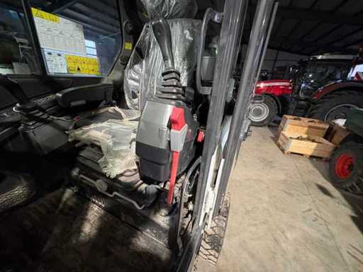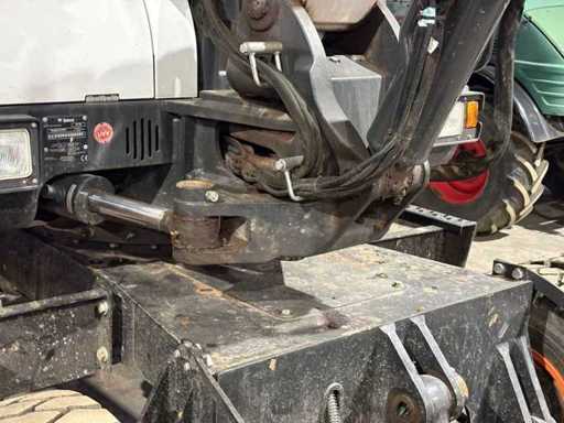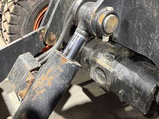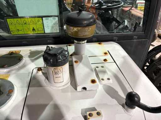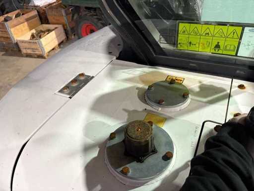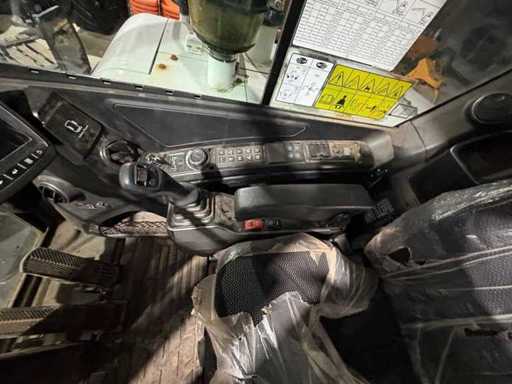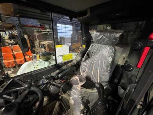 Toestel met afgesloten comfortcabine, joystickbediening, stuurwiel, multifunctioneel display en pedalen.