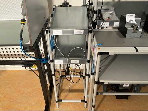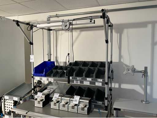 Bouwjaar: 2020; voorzien van magazijnbakken, antistatische tafelmat, verlichting; totale ontwerpbelasting 100kg plus; inclusief Flowstore voorraadstelling, afmeting: H110xB40xD50cm; Rema 9311 balancer, 2x Doga GX045E elektrische schroevendraaier en Flowstore buizenframe ttafel met monitorsteun, afmeting: H114xB54xD64cm