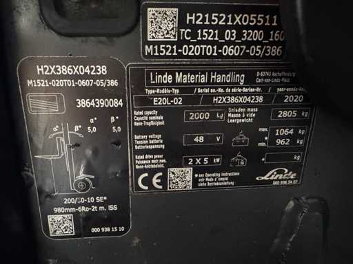 2020 Service + UVV 07/2026 Linde E20L 2.000kg 3.+4. Valve Triplex Scale Camera Volledig Elektrische Vorkheftruck