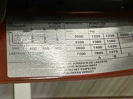 Voorzien van: blue-spot, digitaal display, Zebra labelprinter, Honeywell barcode scanner en display met hoogtemeter en weegsysteem. Inclusief extra accu welke niet is gecontroleerd op werking