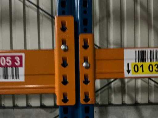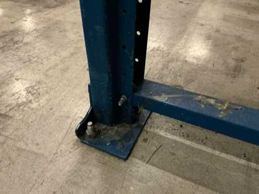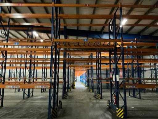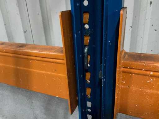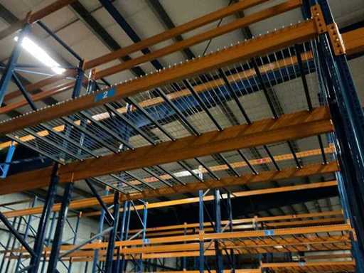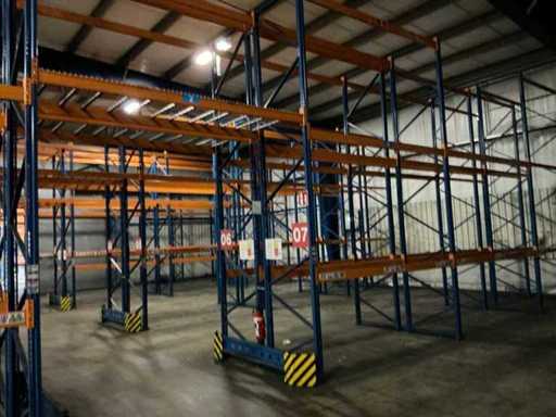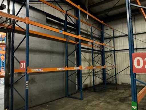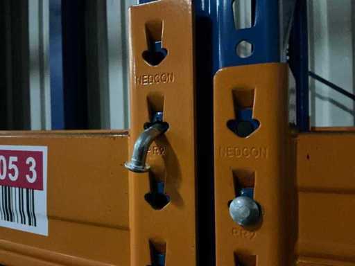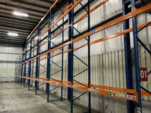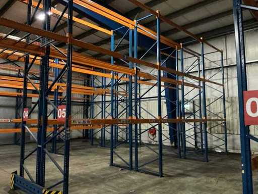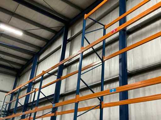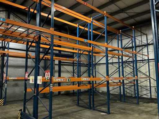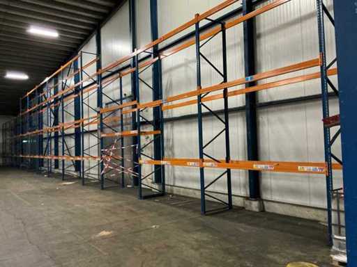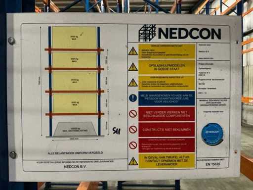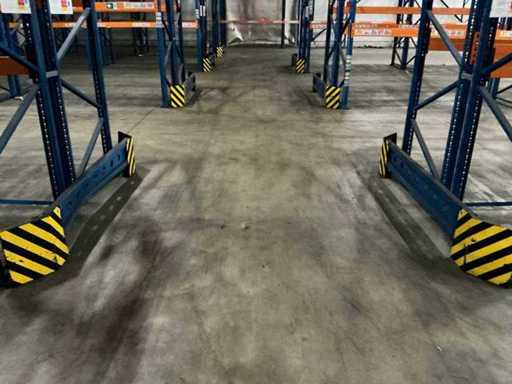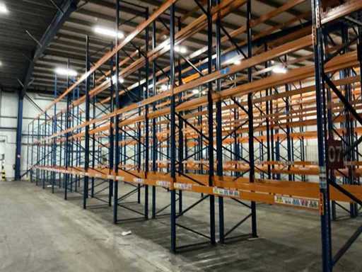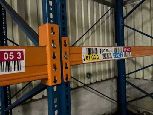 Stelling 1 t/m 10; Bestaande uit 101 secties breedte 330cm, 9 secties breedte 230cm, 70 staanders hoogte 510cm, 59 staanders 700cm; Vaklast sectie 330cm 2500kg; 8x aanrijdbeveiliging