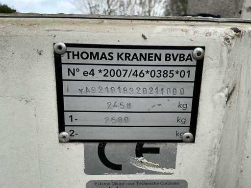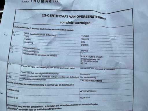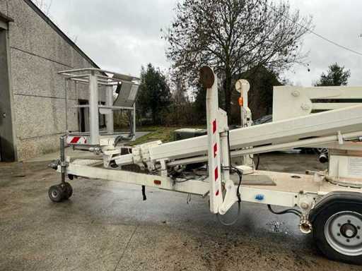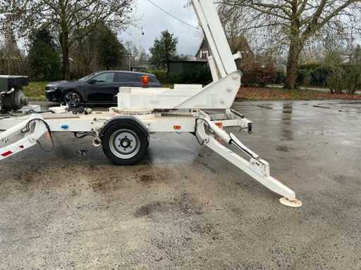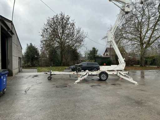Aanhanghoogwerker van het merk Thomas, type 210NWS, gemonteerd op een éénassige werktuigaanhangwagen.