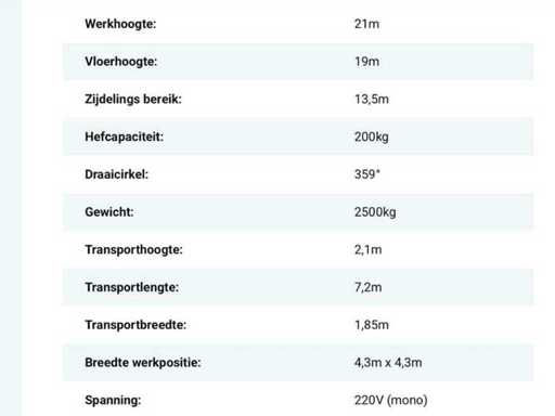 Nieuwe motor met slechts circa 500 werkuren. Werkhoogte: 21m. Zijdelings bereik: 13,5m.