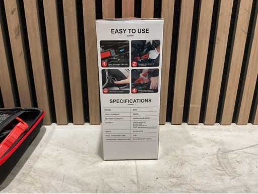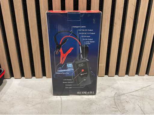Maximale vermogen: 3000A; Batterij capiciteit: 24000mAh (88.8Wh); Laadtijd: 6 uur; Temperatuur 20-60 graden celcius; 12V/10A DC output; 9V/2A QC 3.0 output; 5V/2A input; 5V/2Aoutput; Positive wire clip; Negative wire clip; LCD Display; Aan/uit knop; Compass; LED licht