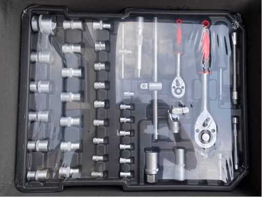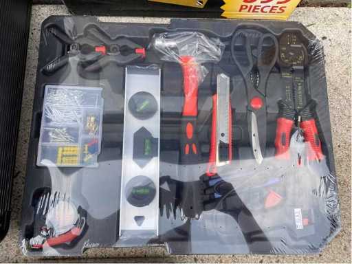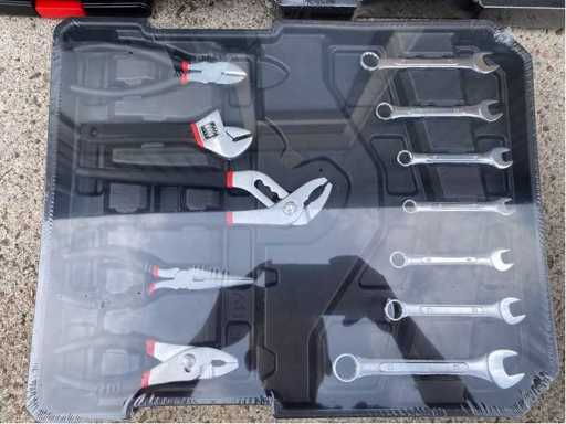 aluminium: ja; met inhoud: ja; omschrijving: voorzien van divers chroom-vanadium gereedschap; inclusief koffer met wielen; ongebruikt in doos