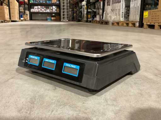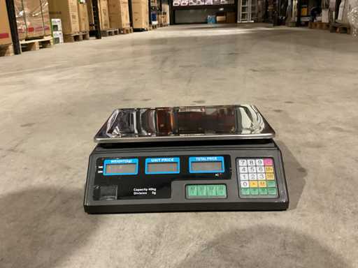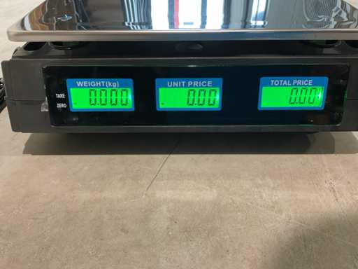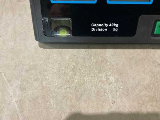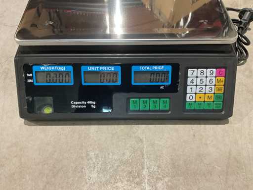Voorzien van Voeding: Netstroom of oplaadbare batterij; Voltage: 220V 50Hz/60Hz (EU-voeding); Batterij: 4V 6AH oplaadbare batterij; Capaciteit: 40 kg; Precisie: 5g; Nauwkeurigheid: 1/3000F.S; Gewicht: 5 cijfers; Eenheidsprijs: 5 cijfers; Totaalprijs: 6 cijfers; Zwart; Ongebruikt in doos (Verpakkings gewicht 3.5 KG)