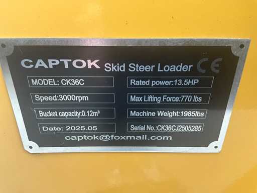 CAPTOK CK36C mini skidsteer op rupsen, bouwdatum 05/2025 - Machine is bijna nieuw met slechts 0,2 draai-uren en wordt geleverd met gladde GP-bak - Dankzij de aux-hydrauliek met snelkoppelingen kun je direct wisselen naar borstel, grondboor, hamer, palletvorken, enz. - Ideaal voor hovenier, aannemer, stratenmaker, boer of verbouwer waar smalle doorgangen en gevoelige ondergrond het verschil maken - Bakinhoud: 0,12 m³ (± 120 liter) – GP-bak inbegrepen - Max. hefkracht: 770 lb (± 350 kg) - verkoper kan laden