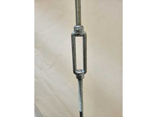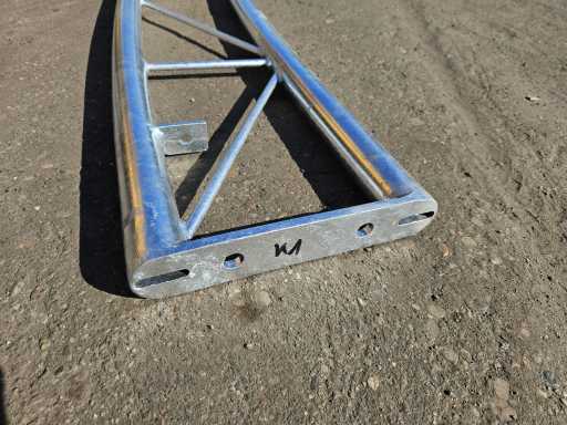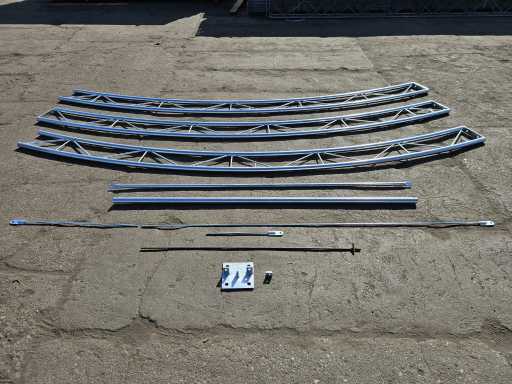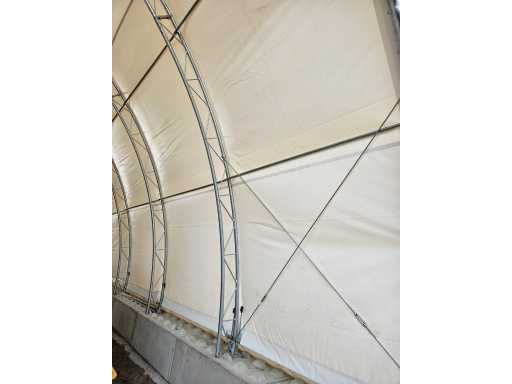 Vrije overspanning van 12000 mm; vakmaat 2500 mm; totaal 8 vakken van 2500 mm; nokhoogte 6000 mm; volblad verzinkte constructie; ongebruikte constructie met nieuw zeil; compleet met druk en trek stangen; voet platen en klein materiaal; wordt netjes verpakt door verkoper;