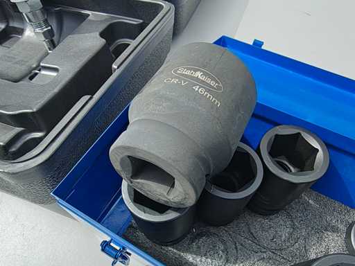 Pneumatische slagmoersleutel 25,4 (1 inch) met doppen en monteerbaar handvat, incl 12 delige doppenset 1", 19-50mm, ongebruikt