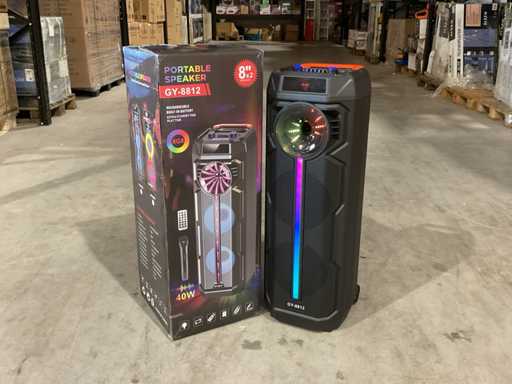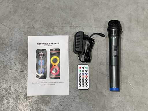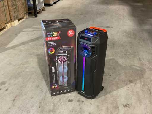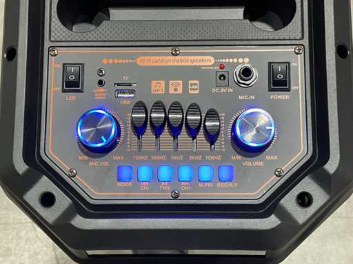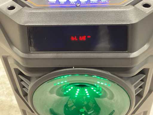 Voorzien van 2x4pw speakers; 8”speaker Horns; Aansluitingen: USB, TF card, BT, AUX; Draadloze microfoon; afstandsbediening; Party verlichting; meerdere microfoon aansluitingen; Ongebruikt in doos.