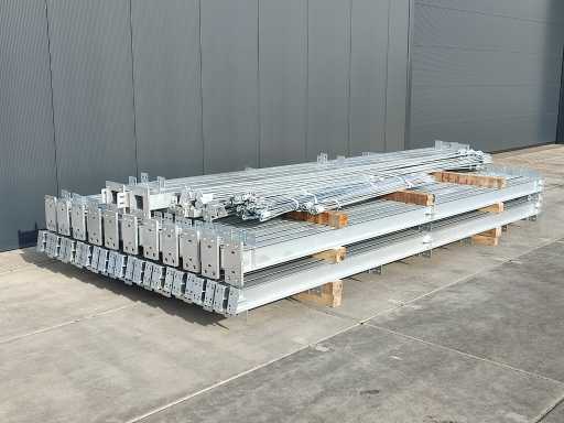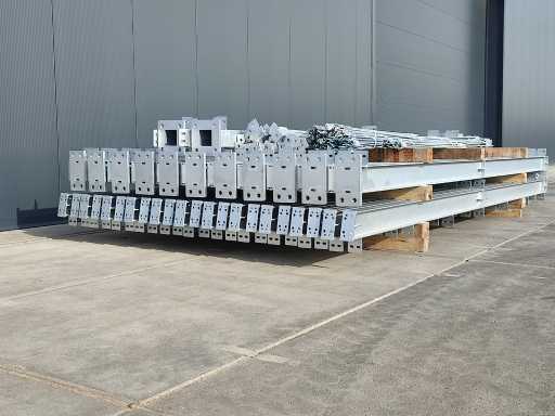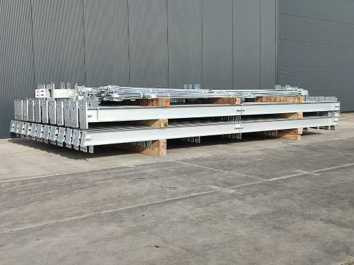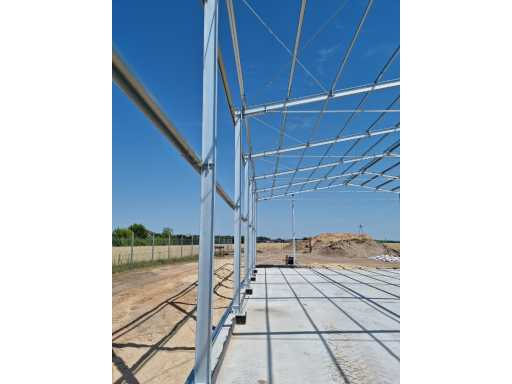 ongebruikte staalconstructie; gegalvaniseerd staal; volblad verzinkt; IPE 160 onderbouw; constructie bestaat uit staanders en spanten; inclusief windverbanden/schoren; loods is transport klaar gemaakt