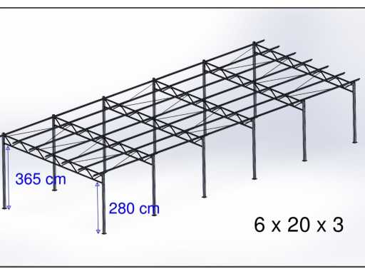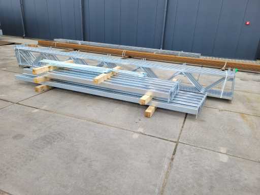 Ongebruikte gegalvaniseerde staalconstructie; poothoogte aan de lage kant is ca 2800mm hoog; poothoogte aan de hoge kant is ca 3650mm hoog; constructie bestaat uit traliespanten; staanders; windverbanden; vakmaat is ca 4000mm; spanten hebben zowel boven als onder een koker profiel van ca 50x50mm; hoogte van de spanten is ca 500mm; staander profiel is ca 100x100mm