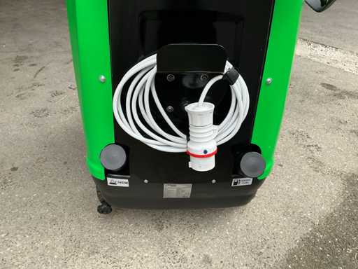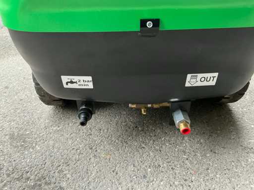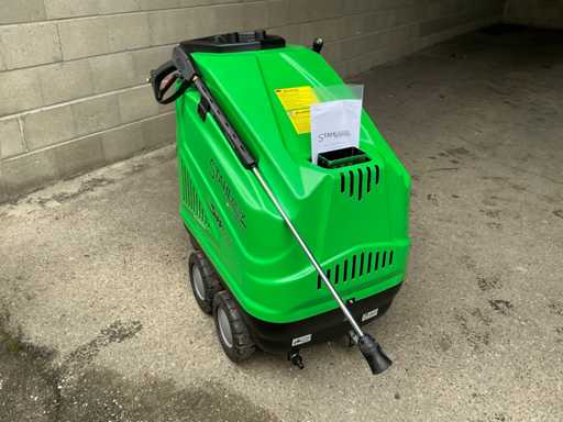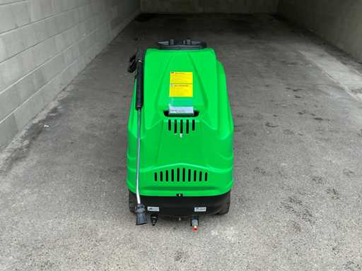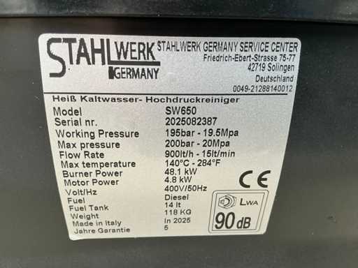 Voorzien van: model: SW 650, werkdruk: 195bar – 19.5Mpa, maximale druk: 200bar – 20Mpa, capaciteit: 900 l/u – 15 l/min, maximale temperatuur: 140°C - 284°F, brander vermogen: 48,1 kW, motorkracht: 5,5 kW, stroomvoorziening: 400V/50Hz, wasmiddel tank: diesel, gewicht: 118kg, lengte slang 5m.