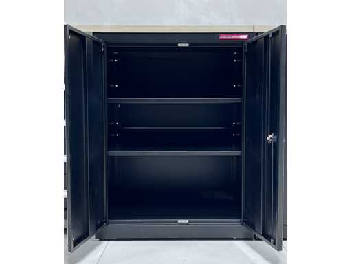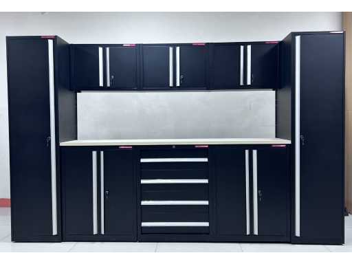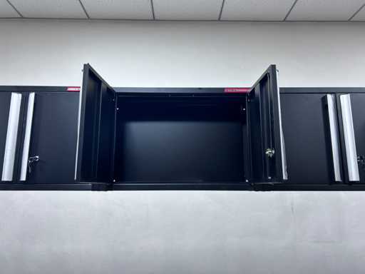 Voorzien van poeder coating; 30 mm houten werkblad; kleur zwart; ongebruikt in dozen (transport afmeting 1,25 m3)