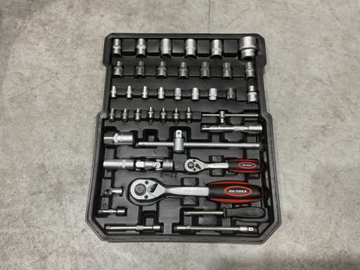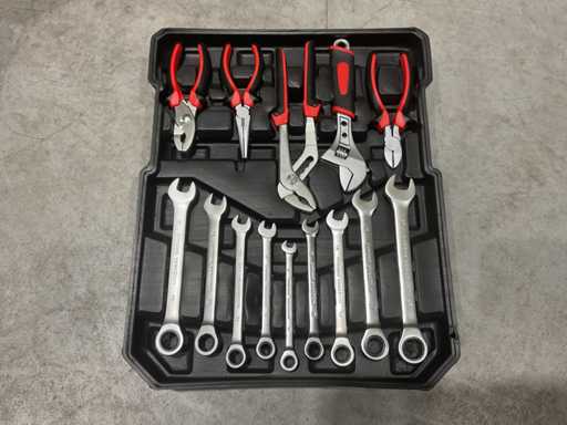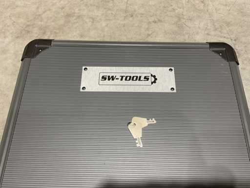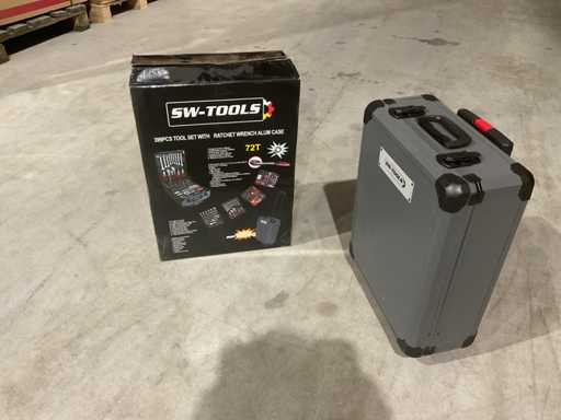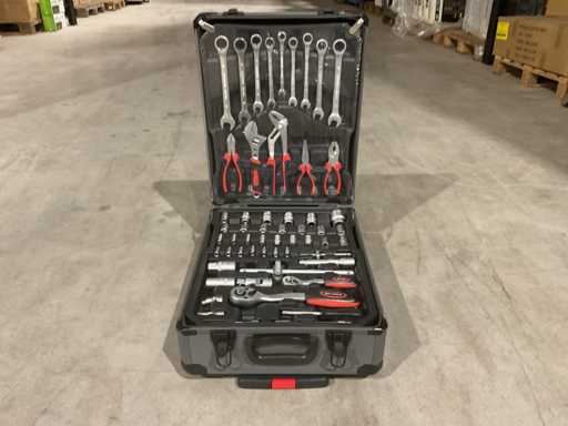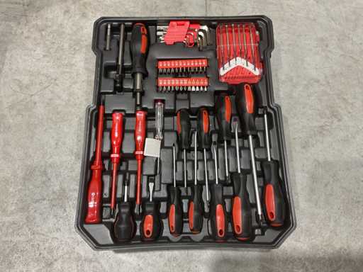 Voorzien van Schroevendraaierset; Zaag; Waterpas; Hamer; Bitset; Inbussleutels; Spanningsmeter; Handgereedschap; Spijkers; pluggen; Aluminium Koffer; Telescoop handgreep; wielen; ongebruikt in doos