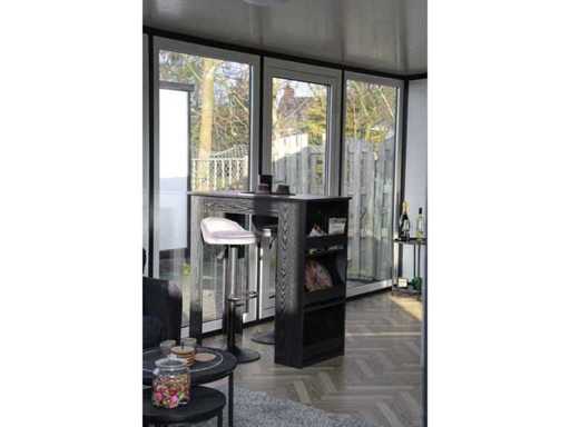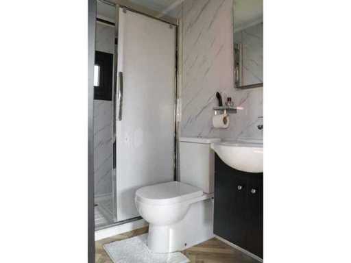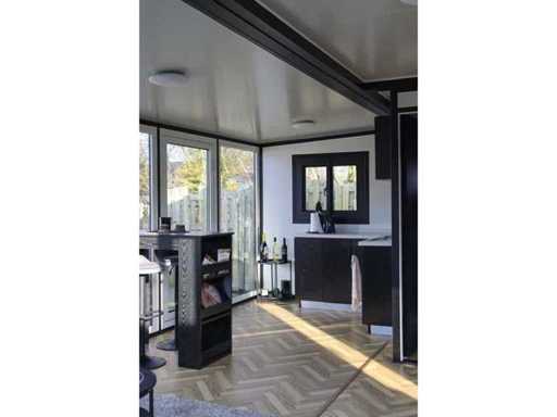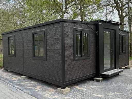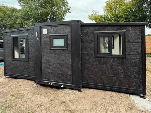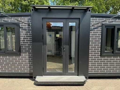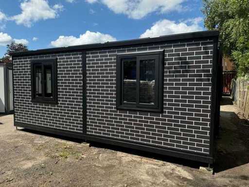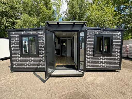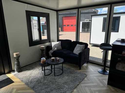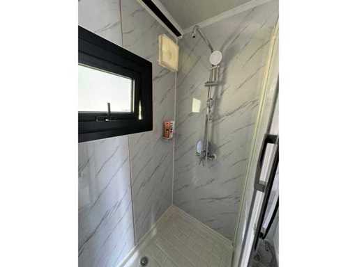 Voorzien van geïsoleerde wanden en dak; 2 slaapkamers; leefruimte met hoekkeuken; badkamer met douche, wc en wastafel; elke ruimte voorzien van verlichting en stopcontacten 230V; meterkast; PVC vloer; aluminium ramen en deuren; afsluitbaar; water, stroom en afvoer kan makkelijk aangesloten worden is voorbereid; ongebruikt en staat transport klaar (let op kleur is steen motief zoals op de eerste foto) (let op meubilair niet inbegrepen) (let op dit model heeft geen glazenwand op de linker zijwand foto’s zijn ter illustratie, van binnen is hij verder exact hetzelfde) (transport afmetingen 590x220x248 cm, gewicht 3500 kg)