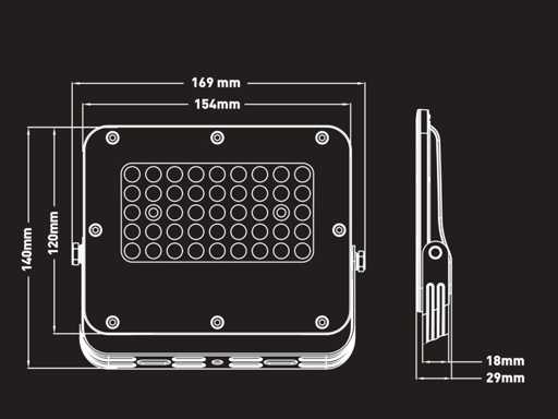 lichtstroom 2830 lumen, lichtkleur daglicht 5000K, afdichting IP65, stralingshoek 90°, product kleur zand zwart, afm 169 x 120 x 29mm, materiaal aluminium en PC lens, met lens nauwkeurige lichtbundels zonder verspilling voor maximale helderheid, bescherming tegen mechanische inslagen IK07, bevestigingsset niet inclusief, levensduur 30.000 uren, voltage 200-240V, sku 1105