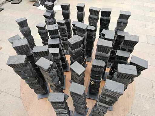 Voeg een exclusief, etnisch tintje toe aan je interieur met deze indrukwekkende set van 40 iconische Afrikaanse handgemaakte figuren. Elke figuur is uniek, zorgvuldig uit massief hout gesneden en afgewerkt in een diepe tint zwart. De kenmerkende, hoekige vorm en de gedetailleerde houtsnijwerken maken deze sculpturen tot een fascinerende blikvanger, of ze nu individueel of als indrukwekkende groep zijn gerangschikt. Perfect voor galerieën, moderne woonconcepten of als speciaal decoratief element in commerciële panden.